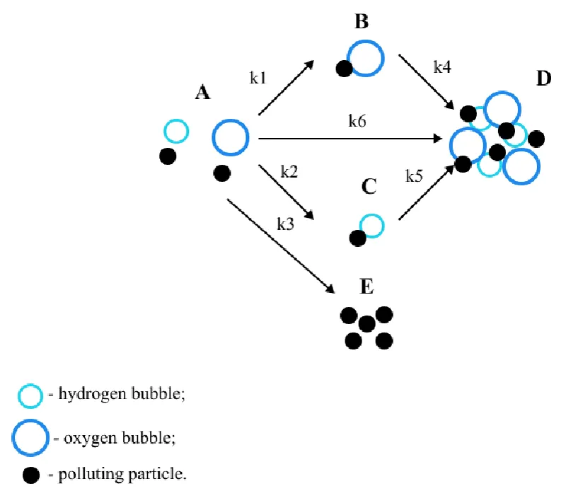 Where CA, CB, CC, CD, CE – particle concentrations in states А, B, C, D, and E; state А – polluting particles in their original form, В – flotation complexes with oxygen bubbles, С – flotation complexes with hydrogen bubbles, E represents the state of precipitated particles, D is the state of particles in the foam layer; k1 coefficient describes the probability of formation of the “polluting particle –oxygen bubble” flotation complex, k2 is the probability of the formation of a “polluting particle – hydrogen bubble” flotation complex, k3 is the probability of precipitation of a particle from state A; k4 coefficient characterizes the rising process of the flotation complex “particle–oxygen bubble”, k5 characterizes the rising process of the flotation complex “particle–hydrogen bubble”, k6 represents the probability of the particle passing directly into the foam layer.