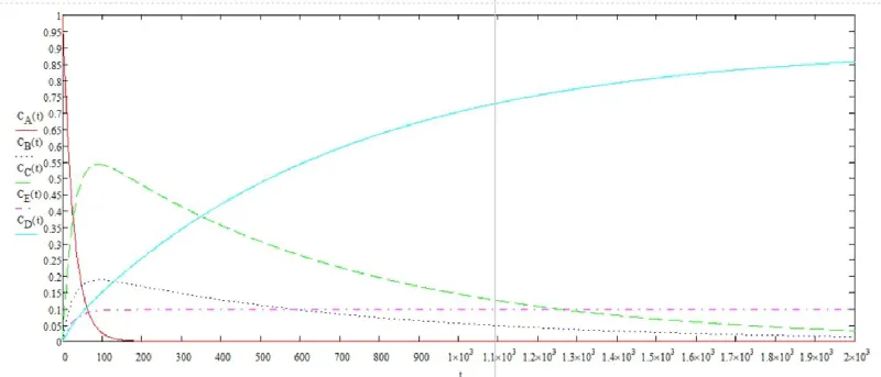 Figure 6: Graphical representation of the solution of a system of differential equations describing the process of electroflotation with oxygen and hydrogen bubbles.