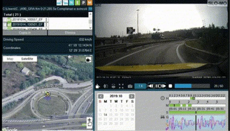 It is useful to use special camera systems equipped with GPS, microphone, and accelerometers to be mounted on the front windshield of the vehicle: these return in multiple screens both the video with the data and the movement of the vehicle on the satellite map synchronized with the video. An additional panel provides lateral and vertical acceleration data, as shown in the following Figure 1.